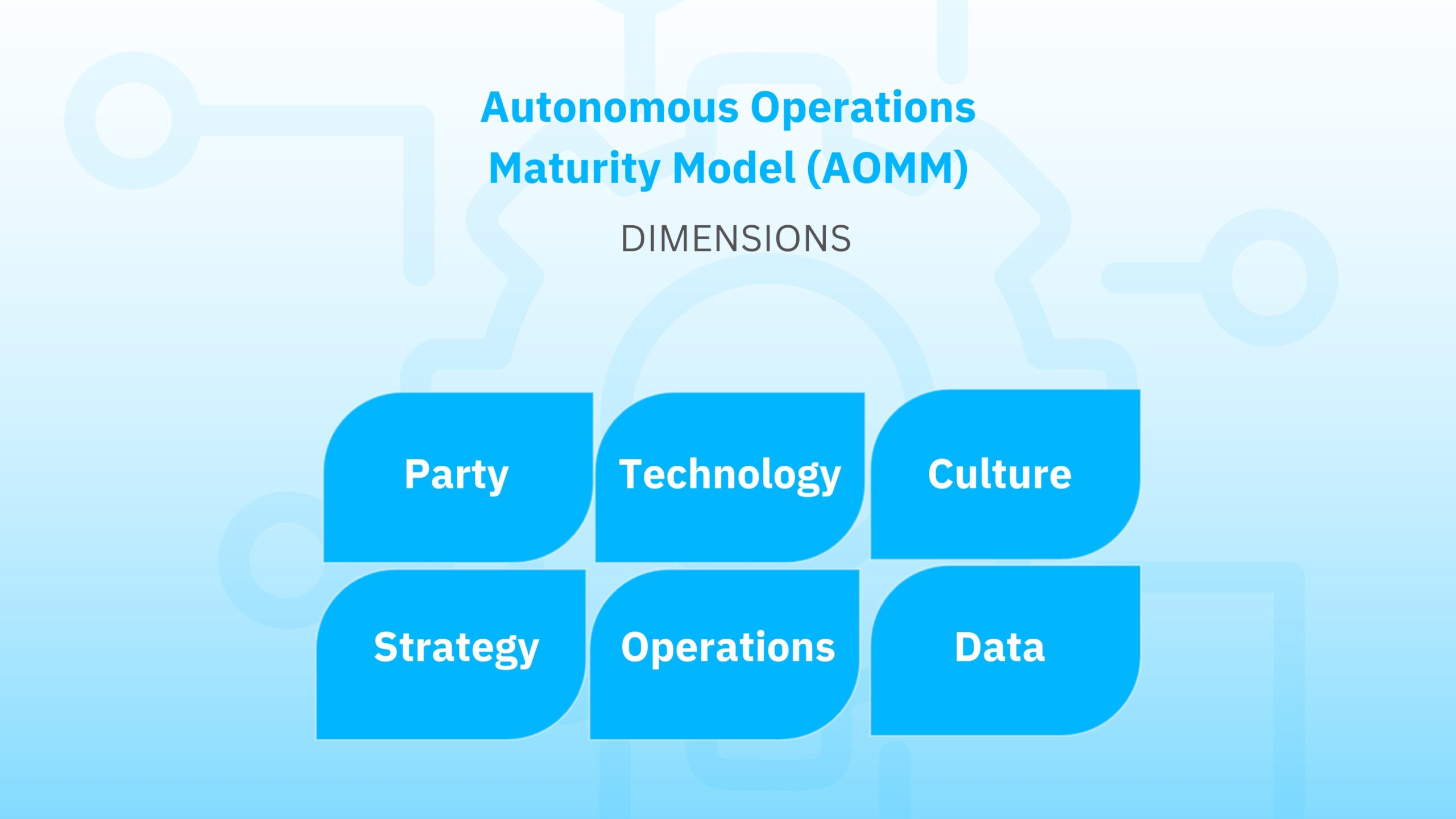 يتكون نموذج نضج العمليات المستقلة (AOMM) من ستة أبعاد رئيسية تحدد معًا مستوى نضج المؤسسة في العمليات المستقلة، وهي كالتالي (بدون ترتيب):
