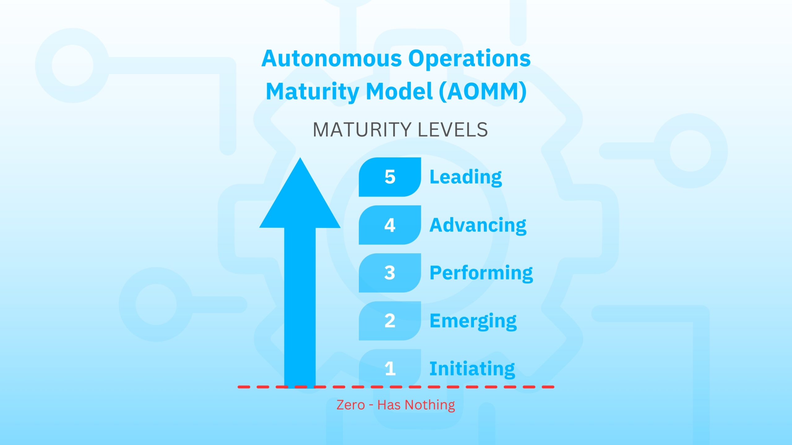 يقوم نموذج نضج العمليات المستقلة (AOMM) بتصنيف المؤسسات بناءً على نضجها في تبني التكنولوجيا والعمليات التجارية المدعومة بالاستقلالية (Autonomy). وتتقدم المستويات على النحو التالي. يمثل كل مستوى مساهمة متزايدة في تحقيق النتائج التجارية مع نضج المؤسسات في تبني العمليات المستقلة.
