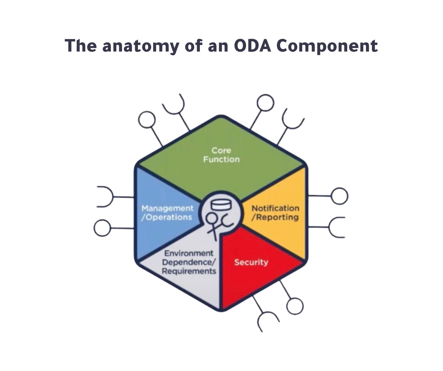 Represented visually by a hexagon (Check the following image), each ODA component conveys key information about its functionalities and operations: