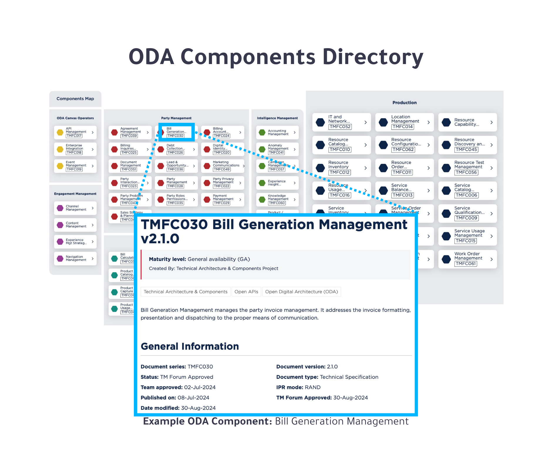 The ODA Component Directory serves as a repository and marketplace for exploring and procuring ODA Components. It acts as a bridge between buyers and software providers, ensuring that components meet the stringent requirements of plug-and-play interoperability within a standardized deployment environment, the ODA Canvas (explained in the next section).
