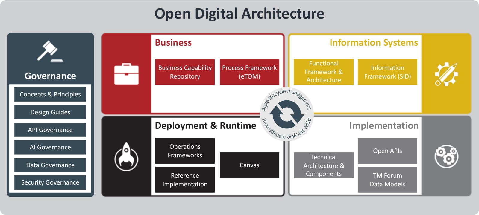 - Governance Element: Governance is essential for managing ODA’s complexity and ensuring operational efficiency. This element enforces adherence to standards, reliability, and adaptation to change, making it easier for telecoms to maintain a robust and compliant operation.